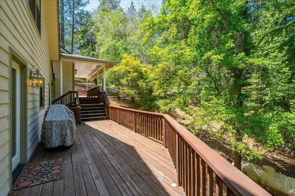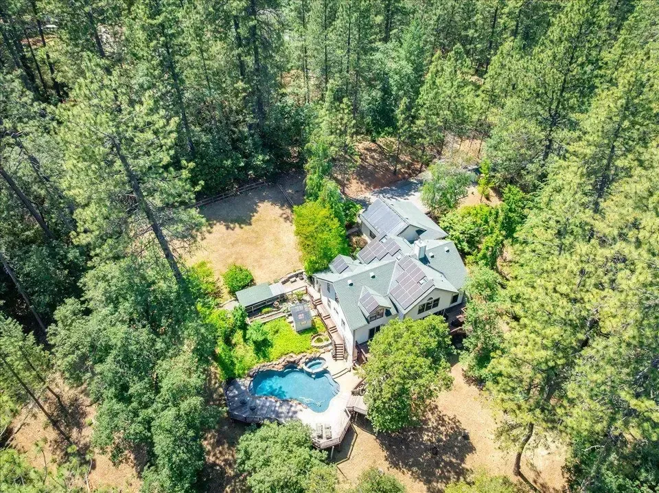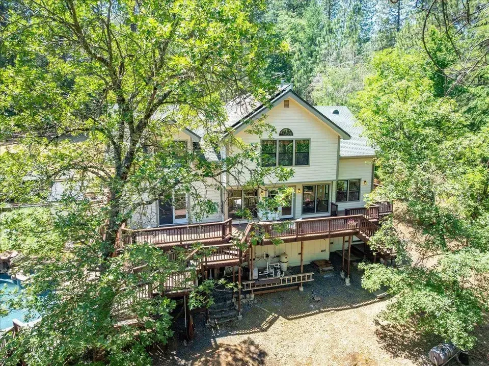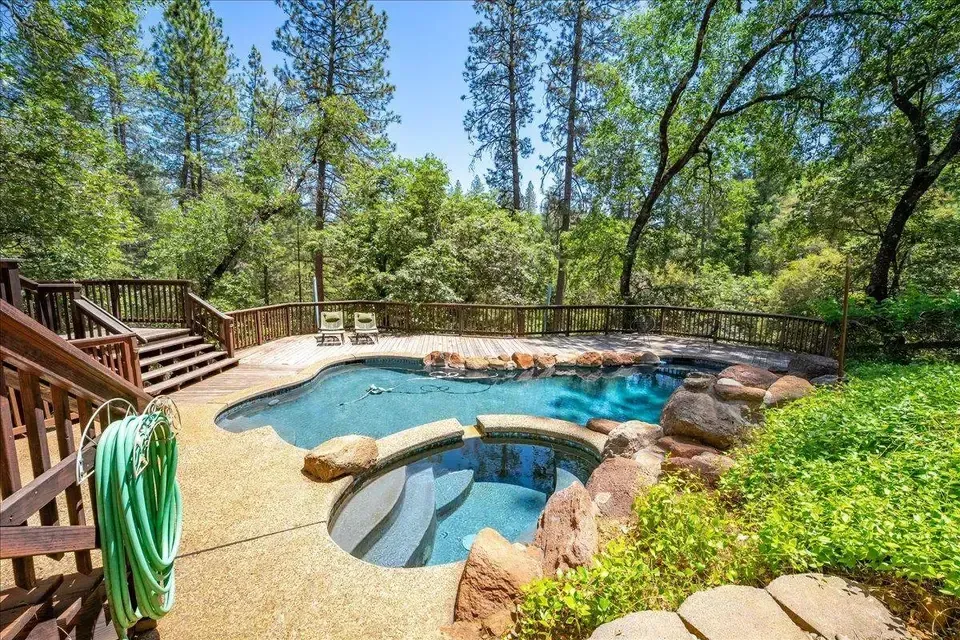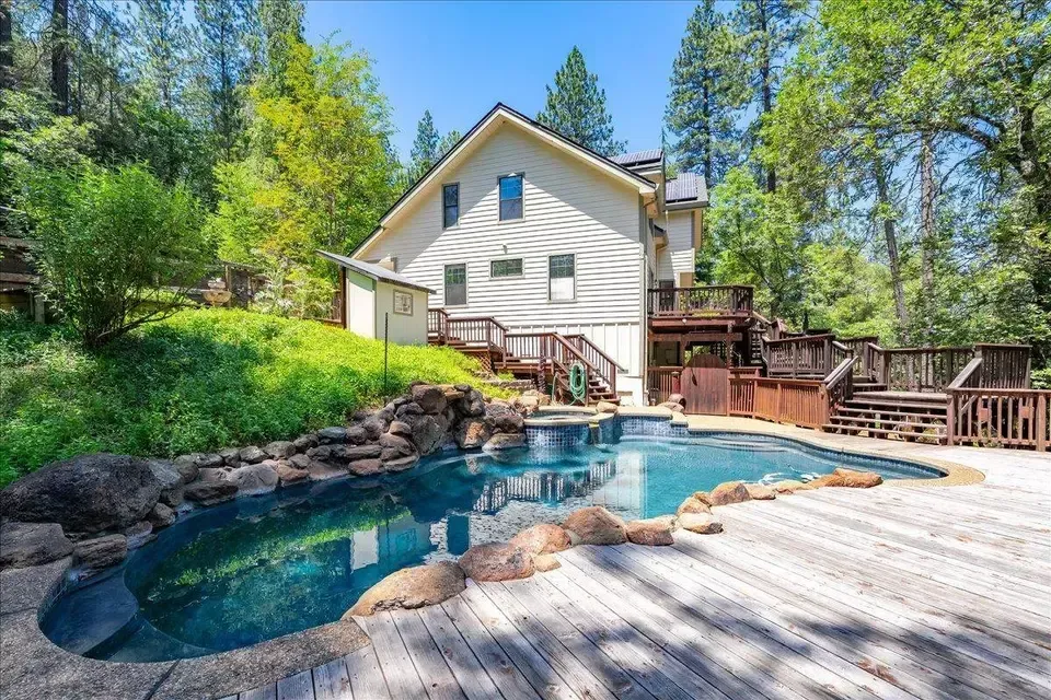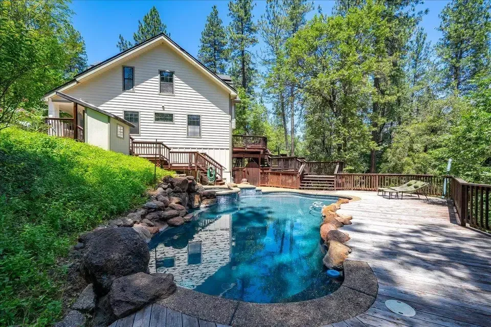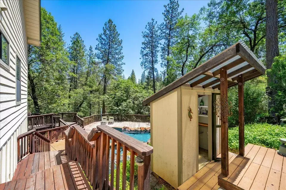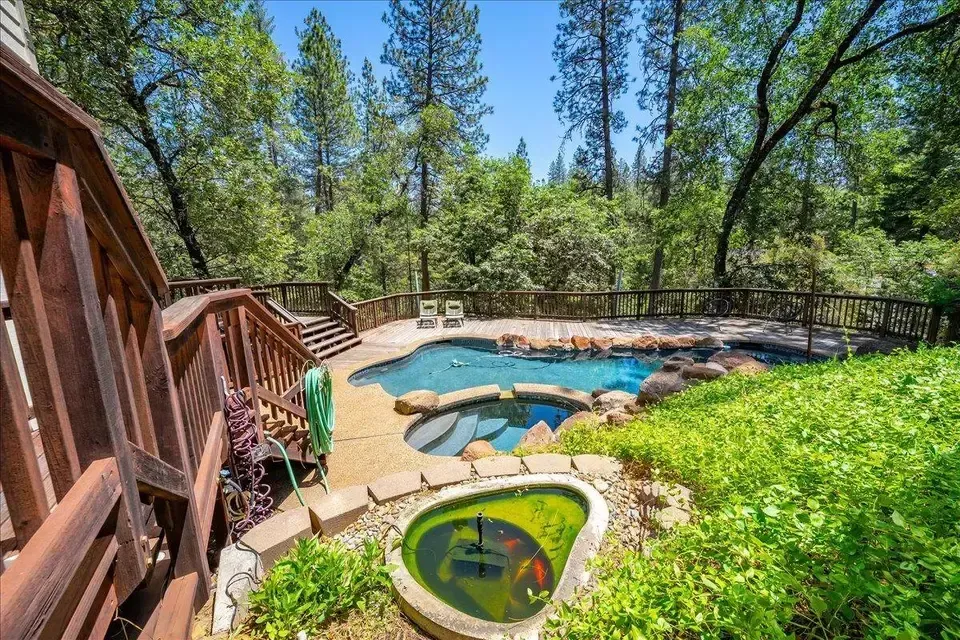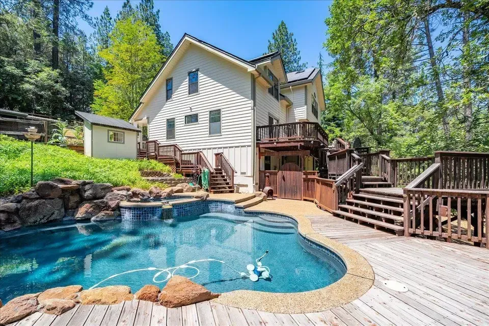 Spacious 4-bed, 4-bath home on 2.5 acres in peaceful Meadow Vista. The Main Floor features a dramatic entry to the living room with Cathedral Ceilings and a wood-burning fireplace, along with a Sunroom and a nicely appointed kitchen. Twin bedrooms include Walk-In Closets and share a Jack & Jill bath. A large laundry room and a spacious pantry/mud room provide Extra Storage and everyday convenience. Upstairs features a cheerful primary en suite, office or 4th bedroom with cedar walls and accents, and another full bathroom. A loft with a theater screen and wet bar - perfect for movie nights rounds out the upper level. Outside, enjoy a Wraparound Deck, Built-In Pool and Spa, Koi Pond,Fenced Garden with Potting Shed, and a separate enclosed area ideal for pets or play. A 2-Car Garage, Covered Carport, Paved Driveway, and expansive under-house Workshop area offer ideal spaces for hobbies, tools, and seasonal items. OWNED SOLAR significantly Reduces Utility Costs and Boosts Energy Efficiency. A Covered Front Porch completes the charm and versatility of this Private hilltop property.