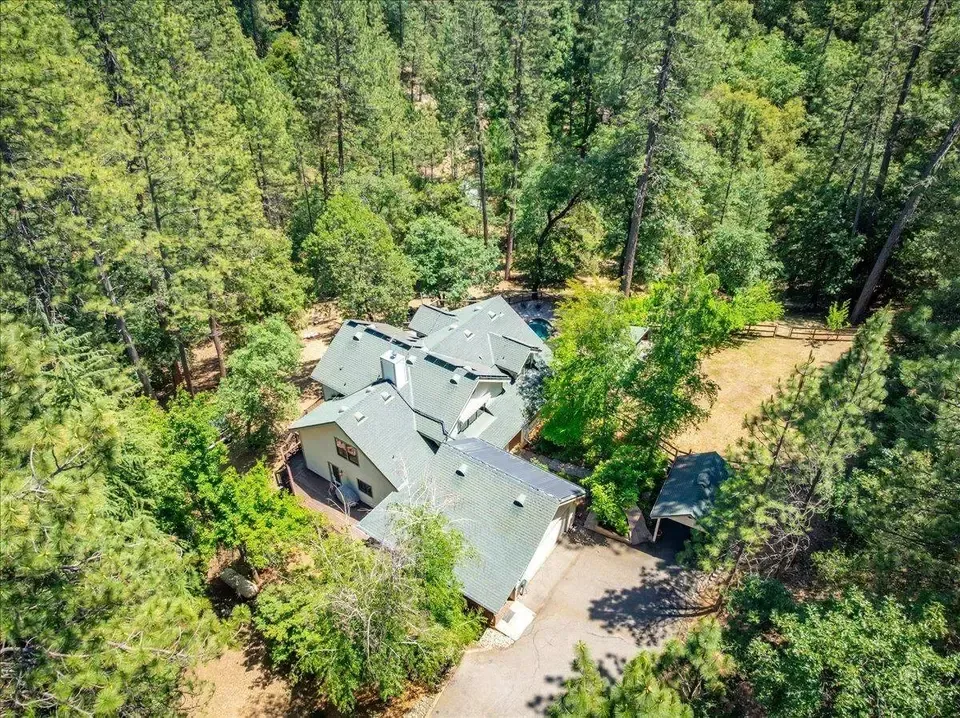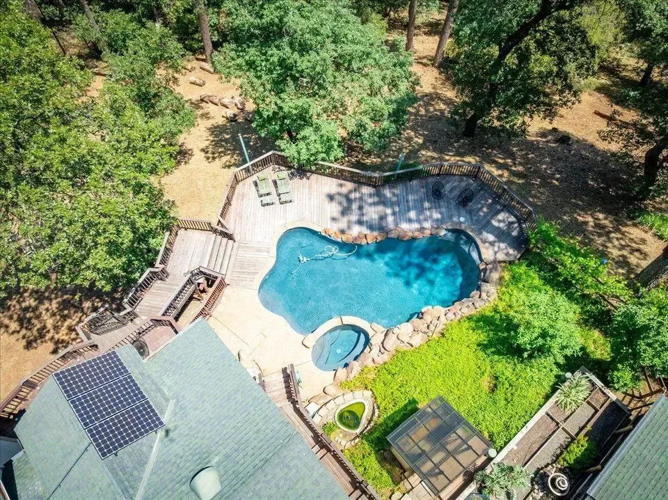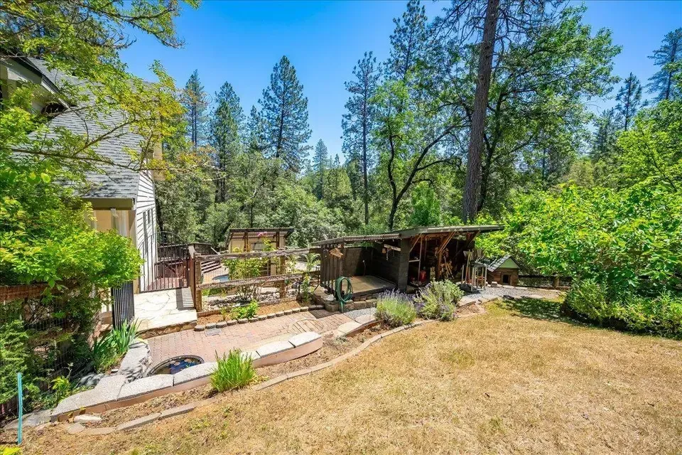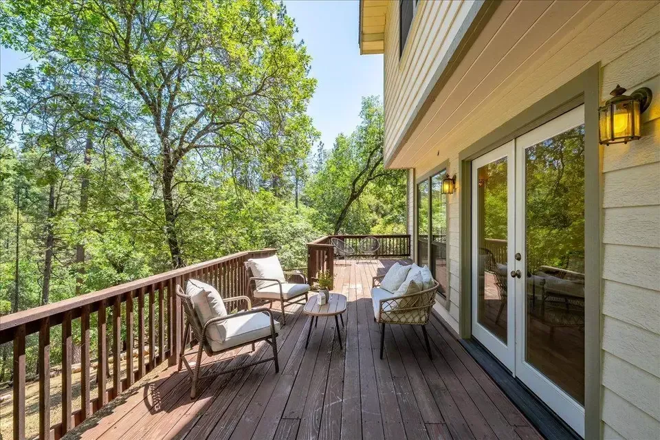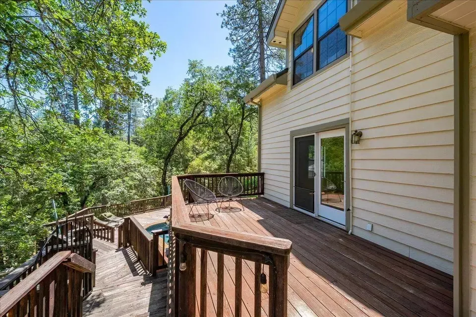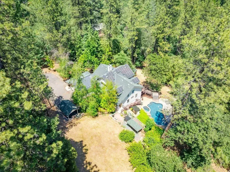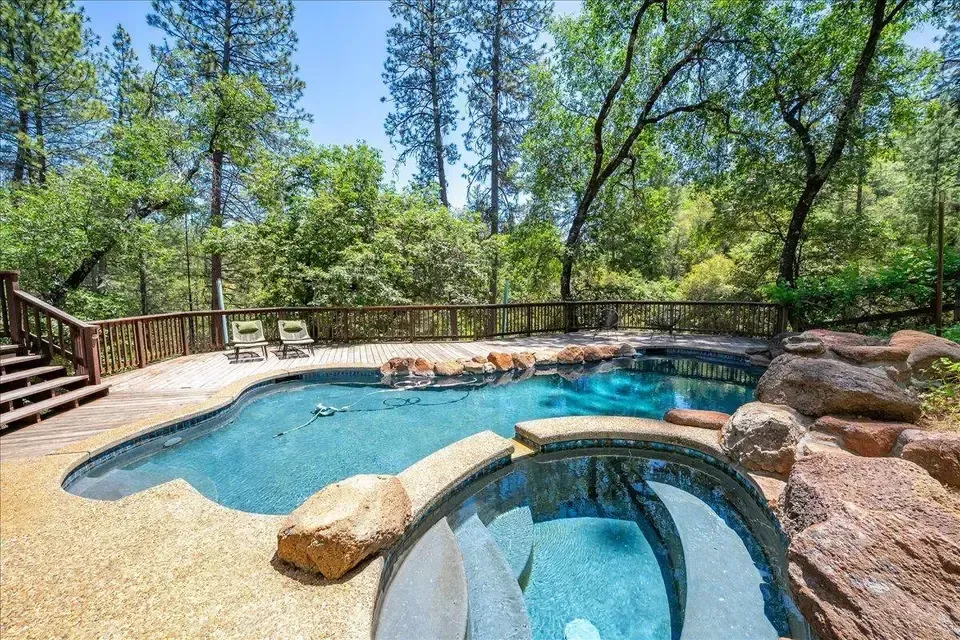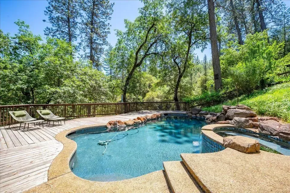 Spacious 4-bed, 4-bath home on 2.5 acres in peaceful Meadow Vista. The Main Floor features a dramatic entry to the living room with Cathedral Ceilings and a wood-burning fireplace, along with a Sunroom and a nicely appointed kitchen. Twin bedrooms include Walk-In Closets and share a Jack & Jill bath. A large laundry room and a spacious pantry/mud room provide Extra Storage and everyday convenience. Upstairs features a cheerful primary en suite, office or 4th bedroom with cedar walls and accents, and another full bathroom. A loft with a theater screen and wet bar - perfect for movie nights rounds out the upper level. Outside, enjoy a Wraparound Deck, Built-In Pool and Spa, Koi Pond,Fenced Garden with Potting Shed, and a separate enclosed area ideal for pets or play. A 2-Car Garage, Covered Carport, Paved Driveway, and expansive under-house Workshop area offer ideal spaces for hobbies, tools, and seasonal items. OWNED SOLAR significantly Reduces Utility Costs and Boosts Energy Efficiency. A Covered Front Porch completes the charm and versatility of this Private hilltop property.