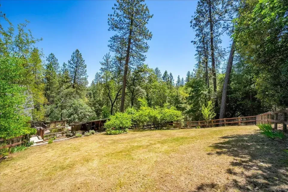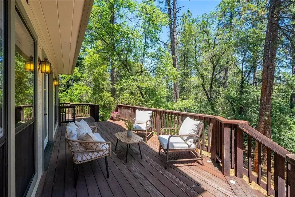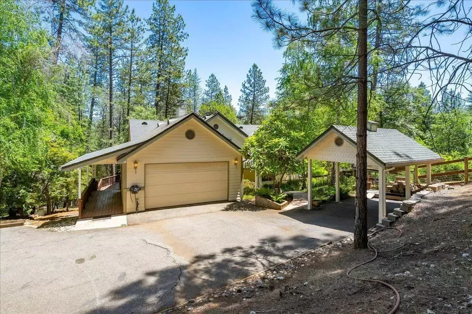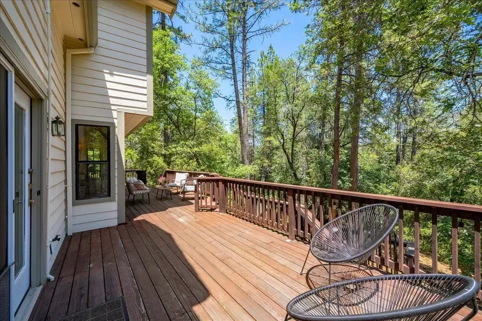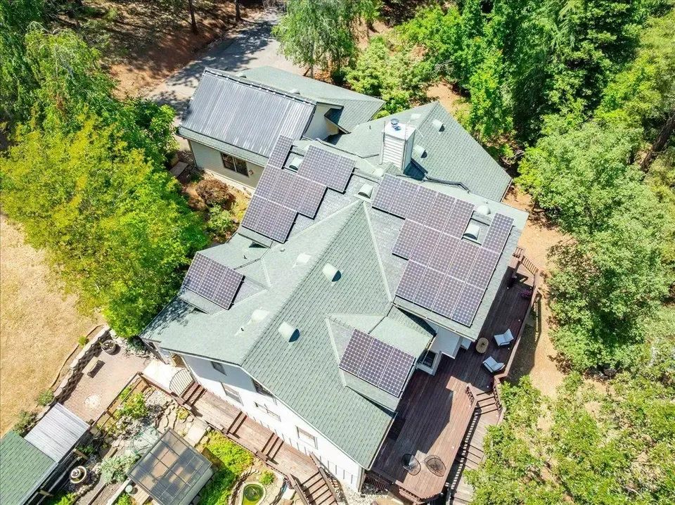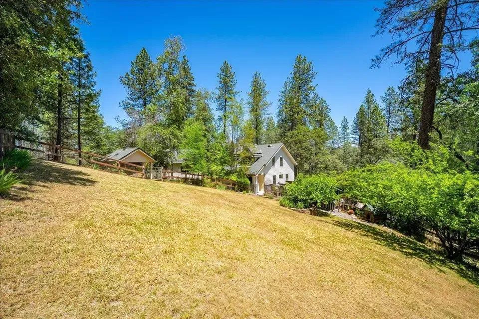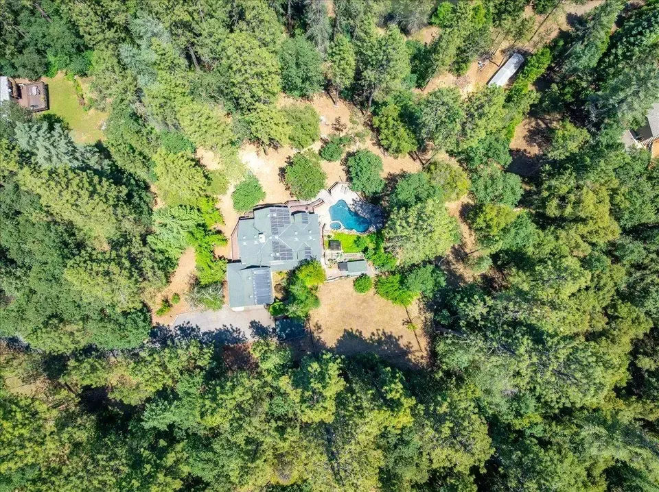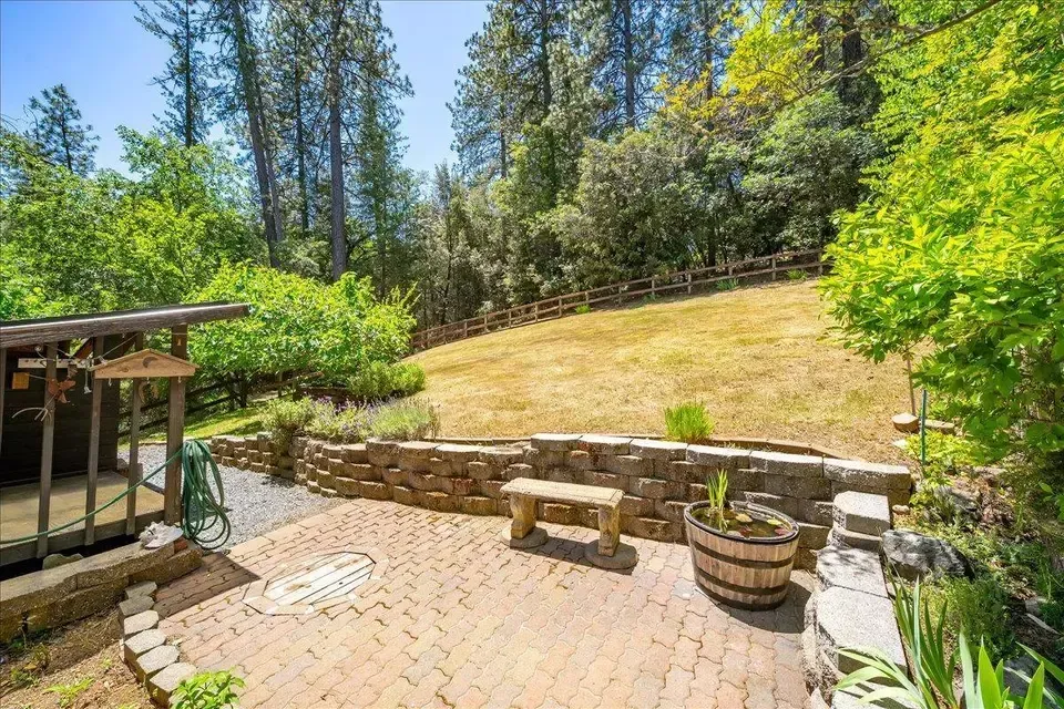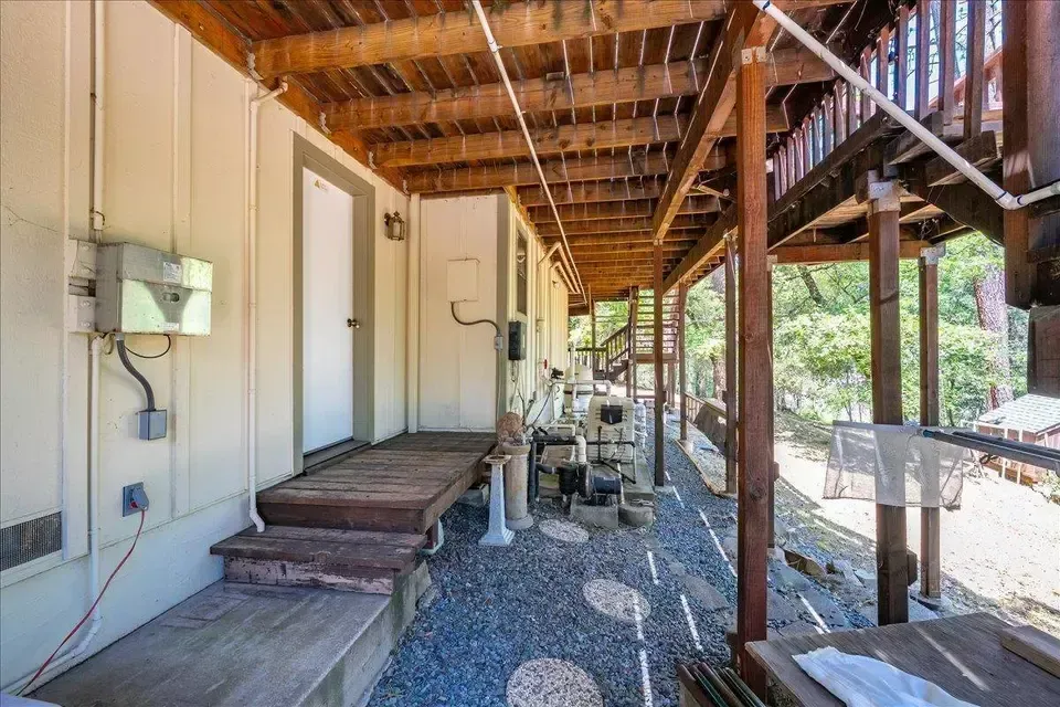 Spacious 4-bed, 4-bath home on 2.5 acres in peaceful Meadow Vista. The Main Floor features a dramatic entry to the living room with Cathedral Ceilings and a wood-burning fireplace, along with a Sunroom and a nicely appointed kitchen. Twin bedrooms include Walk-In Closets and share a Jack & Jill bath. A large laundry room and a spacious pantry/mud room provide Extra Storage and everyday convenience. Upstairs features a cheerful primary en suite, office or 4th bedroom with cedar walls and accents, and another full bathroom. A loft with a theater screen and wet bar - perfect for movie nights rounds out the upper level. Outside, enjoy a Wraparound Deck, Built-In Pool and Spa, Koi Pond,Fenced Garden with Potting Shed, and a separate enclosed area ideal for pets or play. A 2-Car Garage, Covered Carport, Paved Driveway, and expansive under-house Workshop area offer ideal spaces for hobbies, tools, and seasonal items. OWNED SOLAR significantly Reduces Utility Costs and Boosts Energy Efficiency. A Covered Front Porch completes the charm and versatility of this Private hilltop property.